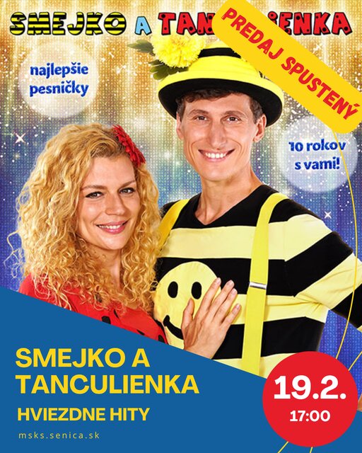 Oslávte to s nami a s našimi najlepšími pesničkami v hudobnej šou Hviezdne hity! Najprv vám zahráme a zaspievame skutočne tie najväčšie pecky z rozprávkového sveta pre najmenších: Vlk a kozliatka, Papagáj, Fúľa bakaná a možno príde aj Baba Jaga. Zaspievame si spoločne Nonono tytyty aj Šlapy šlapy. Nebude chýbať ani Motáčik Popletáčik a Pecivál. A snáď vyjde čas aj na Hu alile! Ale potom už skutočne rozbehneme tú pravú rytmickú tanečnú šou s megahitmi ako Poď von, Bez plastu, Máme tu leto, Ahoj Ahoj, Pápá, Bicykel, Zaber a makaj. Samozrejme bude aj prekvapenie. Dokonca k nám zase zavíta obrovský maskot macko Duško. Nenechajte si ujsť Hviezdne hity vo výročnom prestavení so Smejkom a Tanculienkou! Spolu s nimi príde samozrejme Huncúlik, Bumbác a Panpiano. Tešíme sa na vás ako si spoločne zaspomíname, zatancujeme a zabavíme.