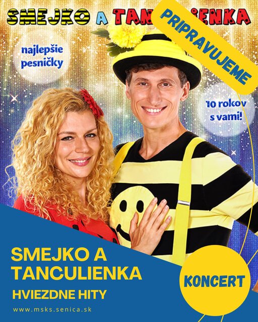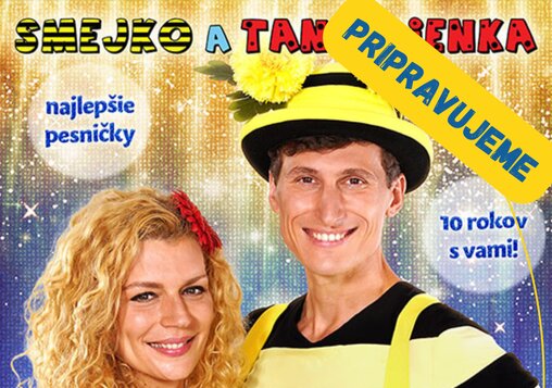 Oslávte to s nami a s našimi najlepšími pesničkami v hudobnej šou Hviezdne hity! Najprv vám zahráme a zaspievame skutočne tie najväčšie pecky z rozprávkového sveta pre najmenších: Vlk a kozliatka, Papagáj, Fúľa bakaná a možno príde aj Baba Jaga. Zaspievame si spoločne Nonono tytyty aj Šlapy šlapy. Nebude chýbať ani Motáčik Popletáčik a Pecivál. A snáď vyjde čas aj na Hu alile! Ale potom už skutočne rozbehneme tú pravú rytmickú tanečnú šou s megahitmi ako Poď von, Bez plastu, Máme tu leto, Ahoj Ahoj, Pápá, Bicykel, Zaber a makaj. Samozrejme bude aj prekvapenie. Dokonca k nám zase zavíta obrovský maskot macko Duško. Nenechajte si ujsť Hviezdne hity vo výročnom prestavení so Smejkom a Tanculienkou! Spolu s nimi príde samozrejme Huncúlik, Bumbác a Panpiano. Tešíme sa na vás ako si spoločne zaspomíname, zatancujeme a zabavíme.